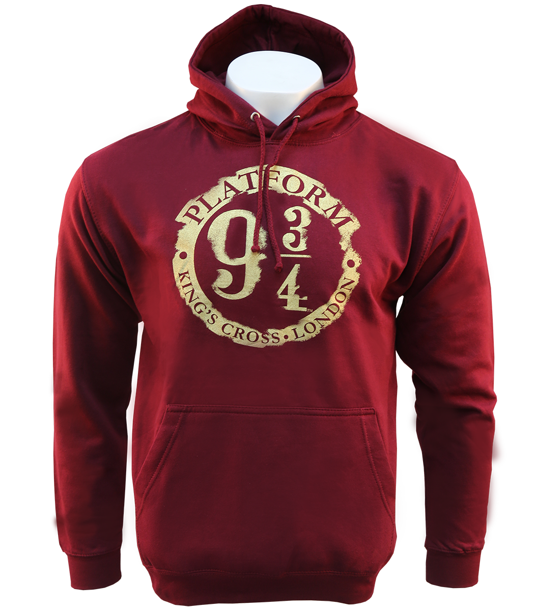 This iconic burgundy hooded jumper features a prominent gold distressed Platform 9¾ logo print. This logo is a replica of the Hogwarts Express train ticket that takes Harry from London to Hogwarts. This Platform 9 3/4 hoodie also includes a full tunnel pocket in front to hide away your magic trinkets, or just to keep hands warm in the cooler months.