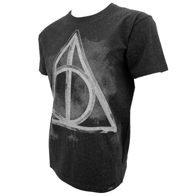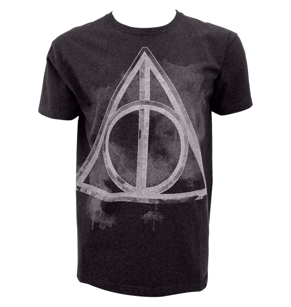 Celebrate the power of the Deathly Hallows with this grey and white t-shirt featuring a stylish smoky design.