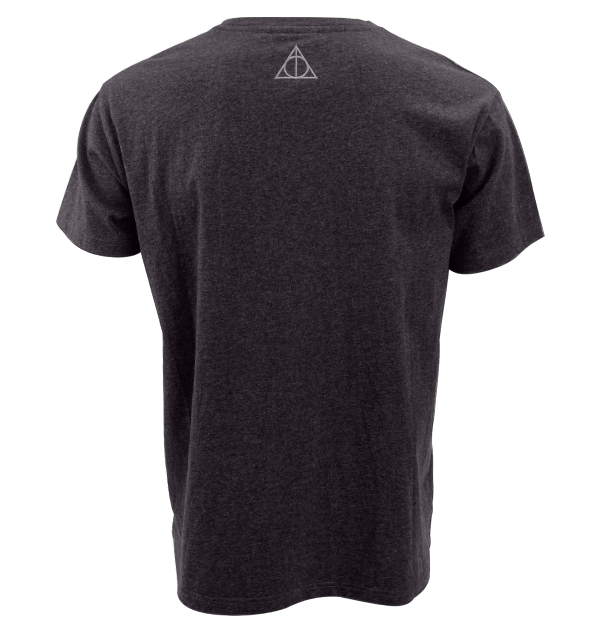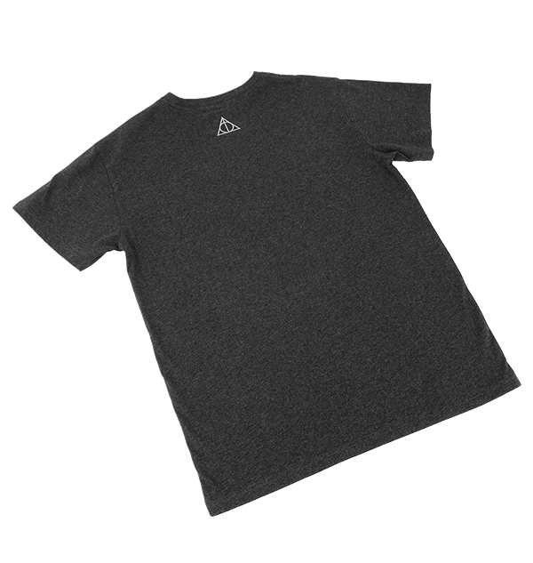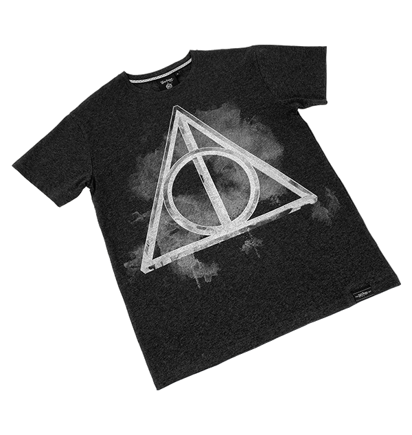The t-shirt features a faded, mystical print of the iconic Deathly Hallows symbol; the Elder Wand, Resurrection Stone, and the Cloak of Invisibility combined. The legend of the Deathly Hallows has led wizards to covet three magical objects in hope of becoming the most powerful magic wielder in the Wizarding World and become the Master of Death.