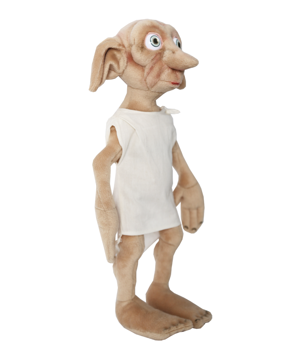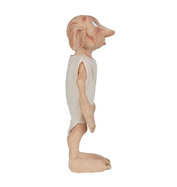 The Dobby soft toy is wearing a white cotton sheet, similarly to what Dobby wore as seen on screen. The soft toy measures approximately 16 inches tall. This Dobby plush is made of cotton, polyester, and some PVC on the soles of the feet. Zinc wire is used inside to allow for posing.