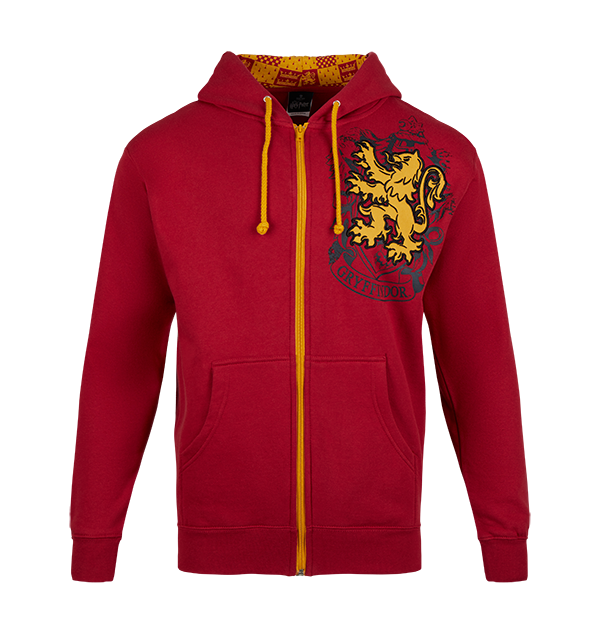 Add some magic to your wardrobe with this unisex Gryffindor hooded sweatshirt. The scarlet red hoodie features a yellow lion, the traditional symbol of the Gryffindor house, and is complete with the lion icon and crown printed in the lining of the hood. The house name is screen-printed along the sleeve in yellow. The hoodie also includes a full tunnel pocket in front, a yellow zip and two yellow strings which can be adjusted for a suitable and comfortable fit.