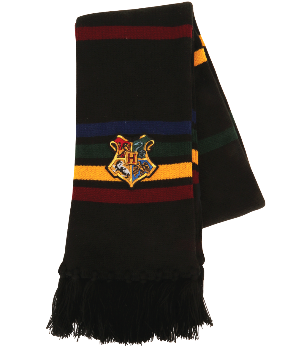 This cosy black scarf features an embroidered patch of the Hogwarts school crest, generously sized tassel embellishments at the ends, as well as coloured stripes representing each of the four houses: red for Gryffindor, green for Slytherin, blue for Ravenclaw, and yellow for Hufflepuff.