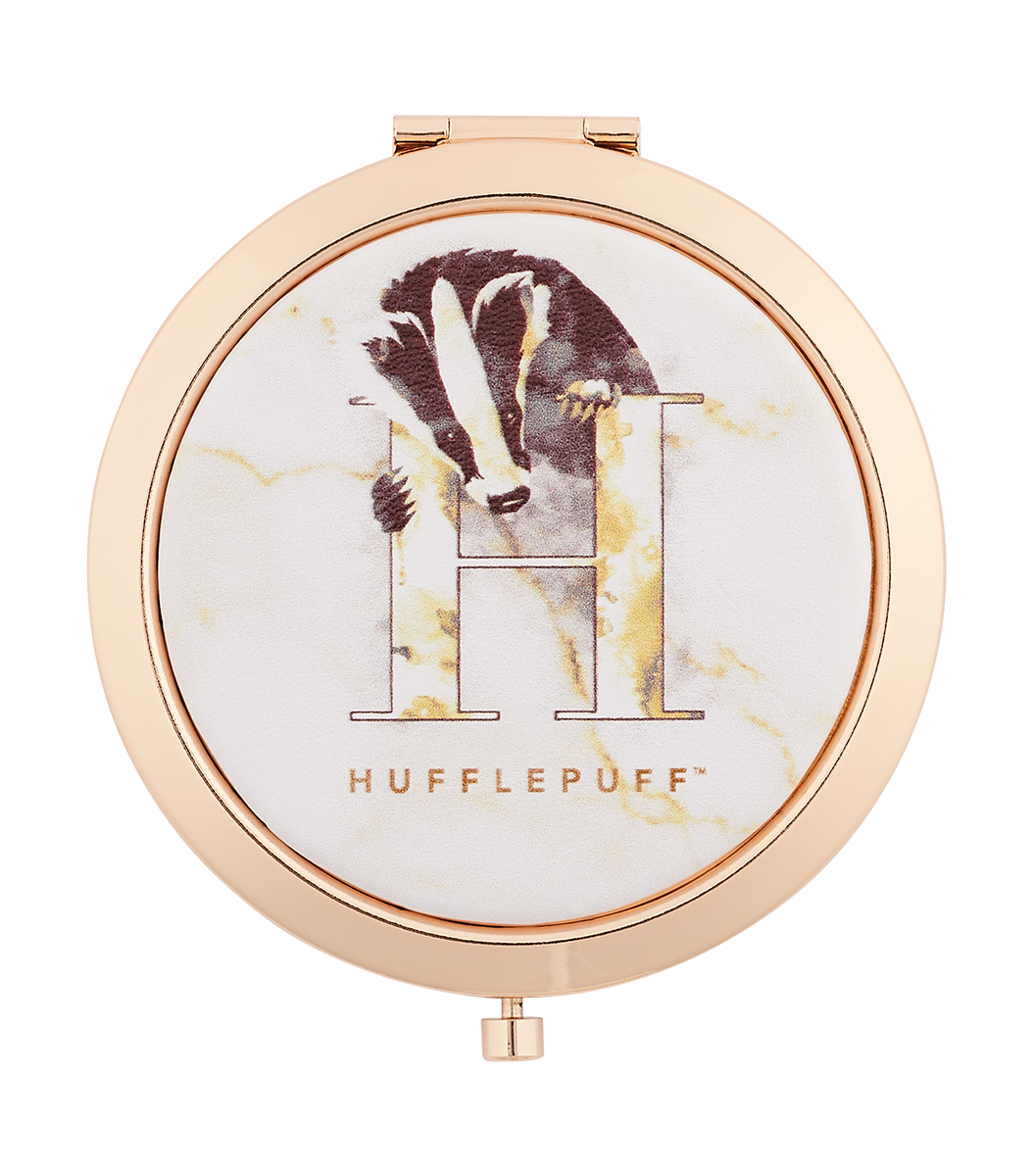 The iconic Hufflepuff badger is featured on the front of the mirror alongside an H, representing the Hufflepuff House. This mirror is the perfect accessory to keep in your handbag for precise touch-ups throughout the day and on-the-go. Keep away from heat.