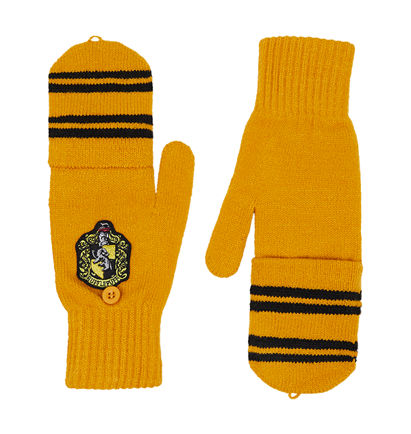 Keep warm and cosy on trips between Hogwarts and Hogsmeade with these Hufflepuff Mitten Capped Gloves. The gloves come in a mustard yellow design and have black stripes across the centre, the traditional house colours of Hufflepuff.