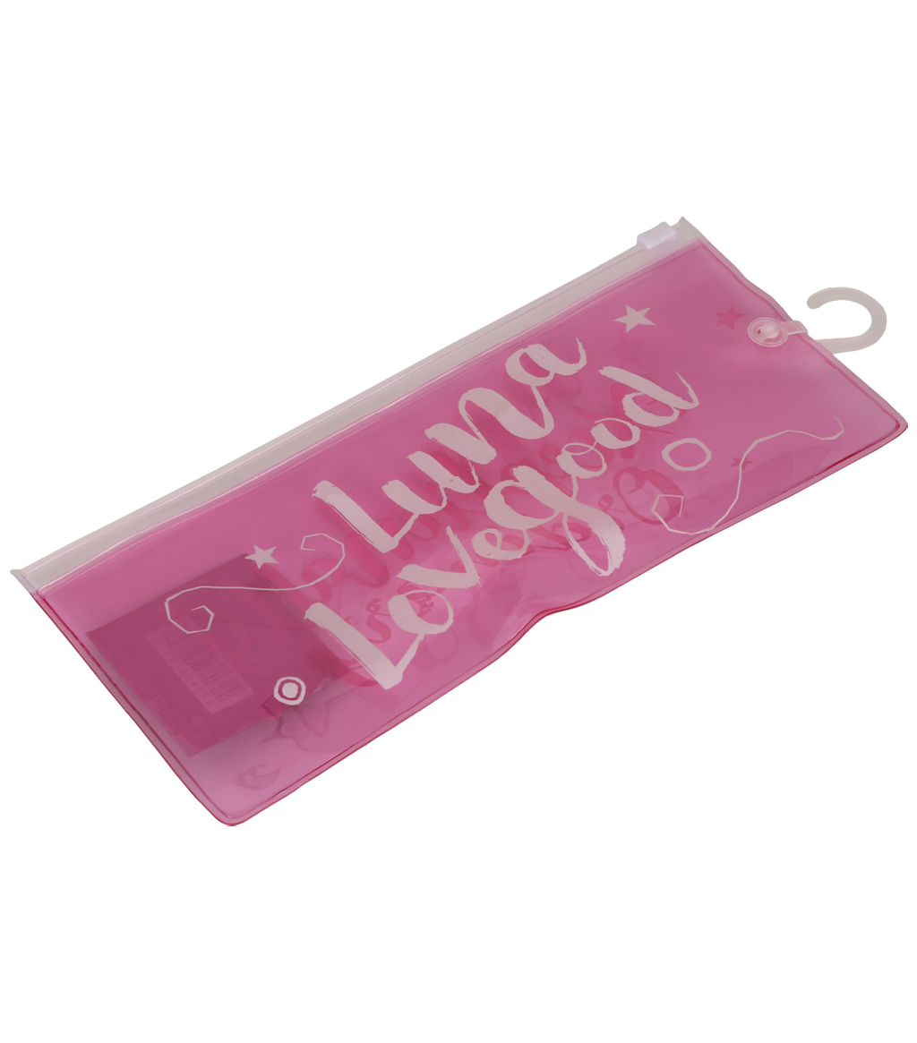 A pair of replica Spectrespecs, as worn by Luna Lovegood in Harry Potter and the Half-Blood Prince. These replica Spectrespecs are made of hard plastic, with a printed pattern across the frame. One lens is pink, and the other is blue. The Spectrespecs come in a protective plastic, zip-lock wallet which reads 'Luna Lovegood' on one side and 'Exceptionally Ordinary' on the reverse