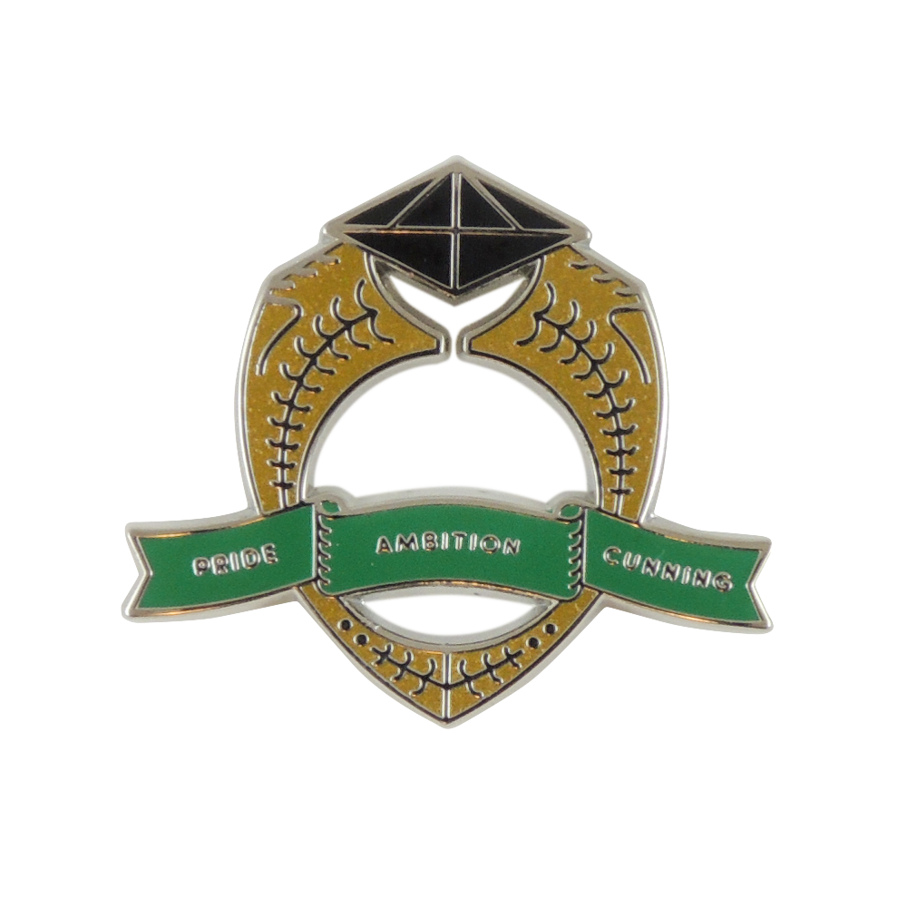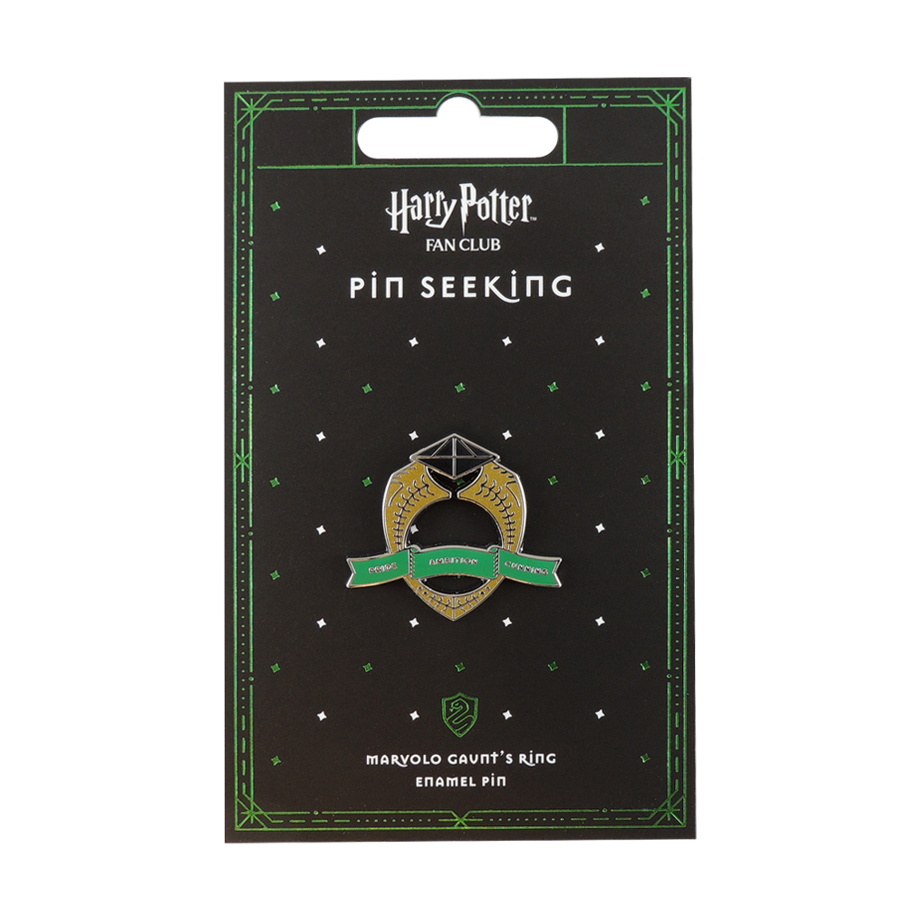 Marvolo Gaunt's ring is no ordinary family heirloom, as it holds one of the Deathly Hallows: the Resurrection Stone. This pin features the enchanted ring behind a green banner, decorated with the wording "Pride, Ambition, Cunning".