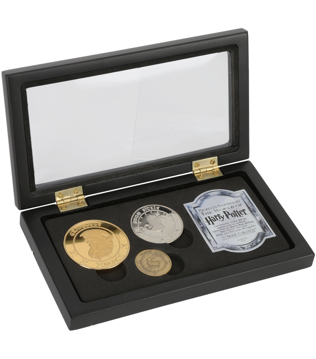 Each double-sided coin is hand struck in 24k gold, silver or bronze-plated brass and features a highly detailed design specific to each coin; a dragon on the golden Galleon, a griffin on the silver Sickle and a goat on the bronze Knut. This film prop replica set comes in a black presentation box, ready for display, making this the perfect gift for Harry Potter fans and collectors.
